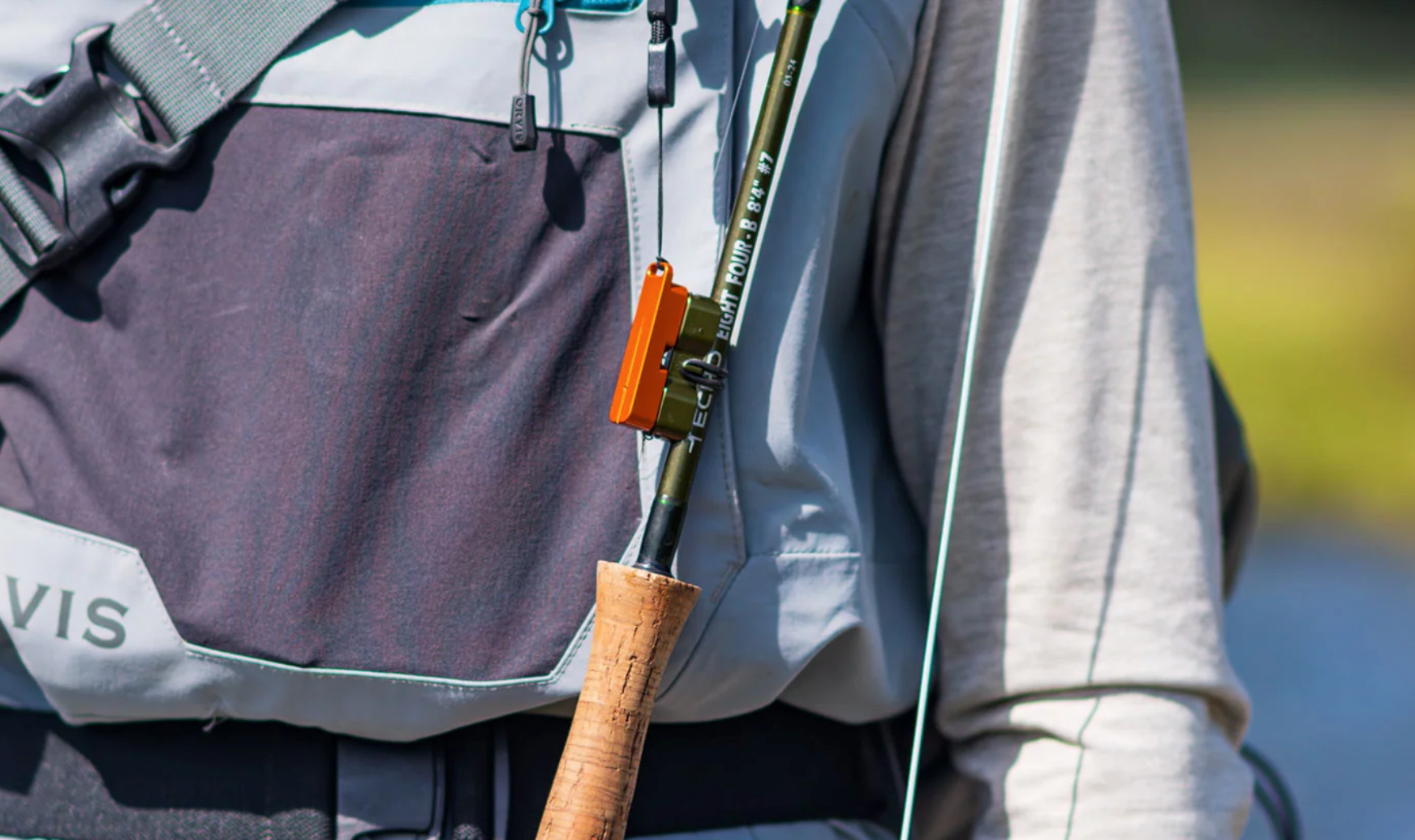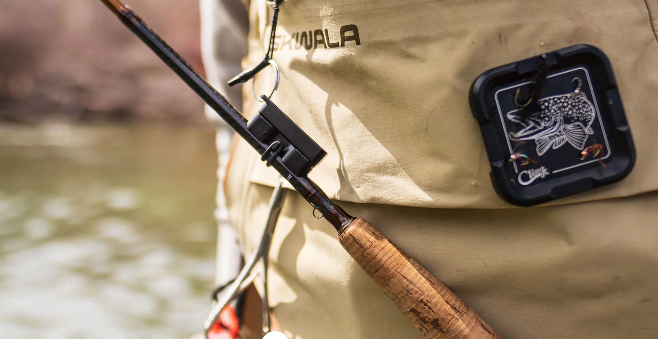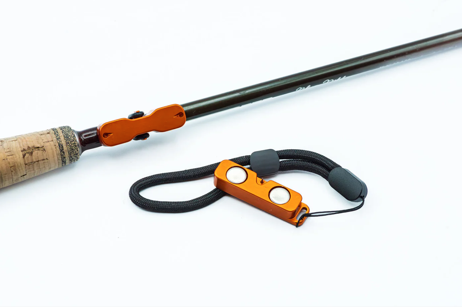 The Rod Rack is a two-part system designed to hold your fly rod securely during fly changes, fish releases, snack time, and any other situation where you might need to set your rod down for a minute. The base plate securely attaches to the butt of your rod with a strong rubber clasp, while the top magnet is easily attached to your waders, pack, or vest. Get them close, and click, your rod is secure.
