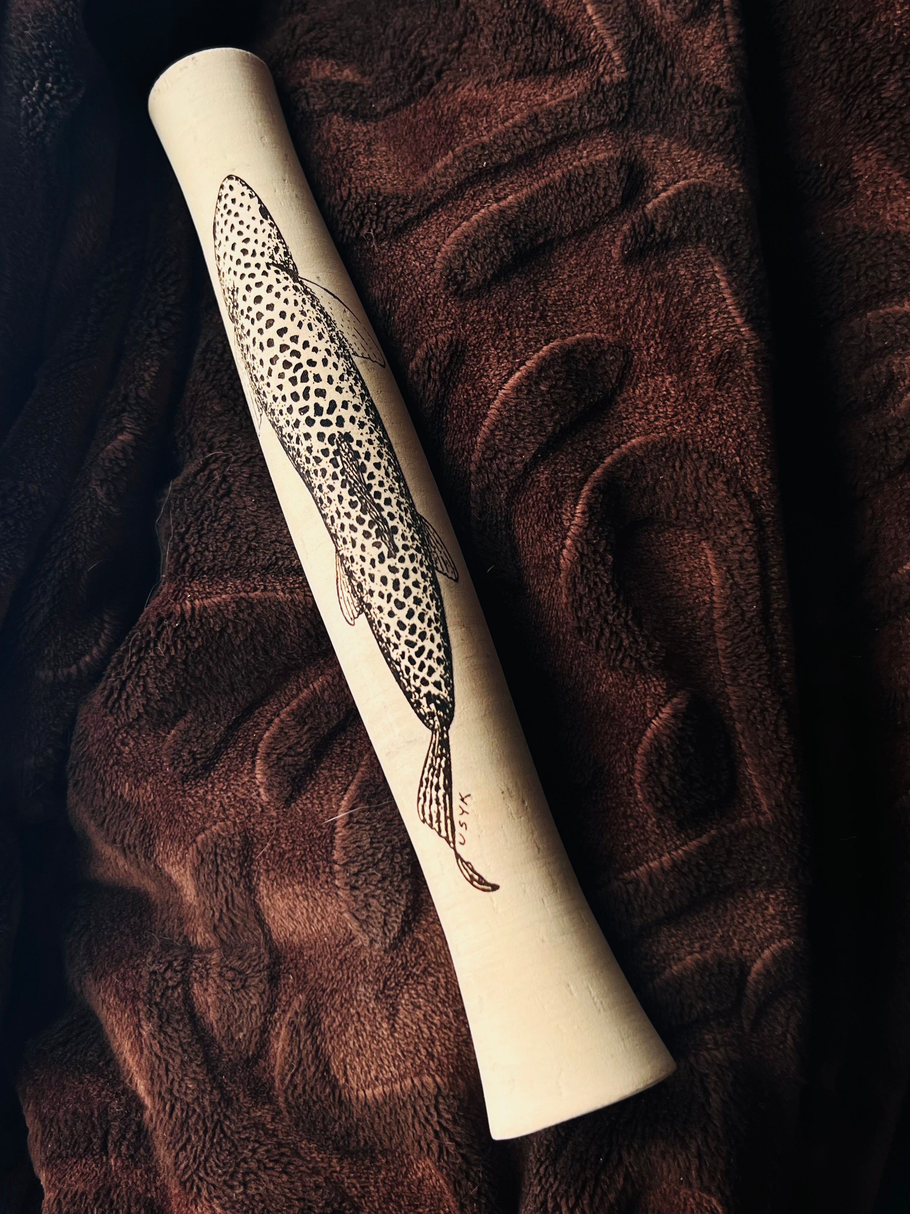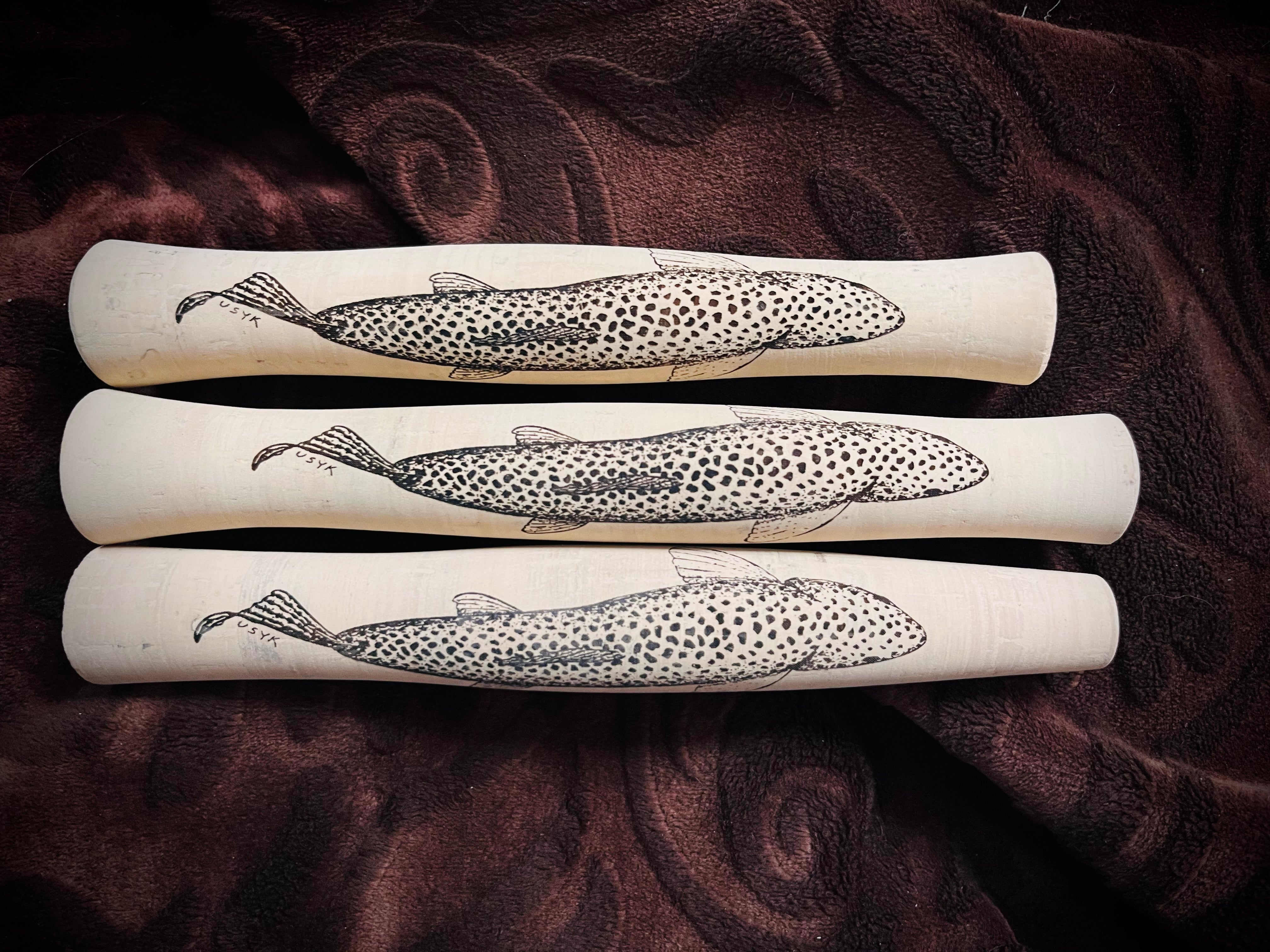 Add a laser burned cork grip to your JP Ross Rod. These Grips are made by us and with genuine Mark Usyk Art. Mark draws the art to our specifications, we digitize and transfer the files to the laser for engraving.